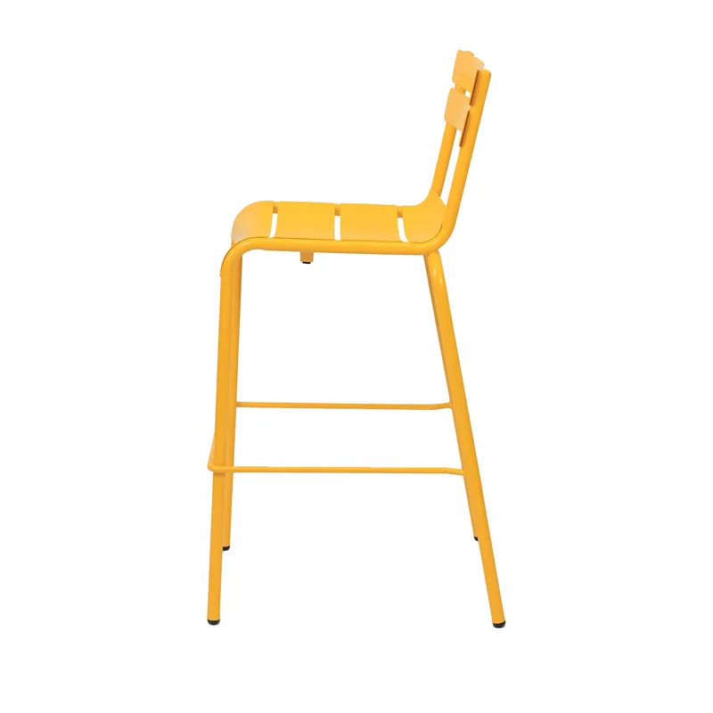 The metal steel slat seat and back which is feature design for both indoor and outdoor use. Rainwater will not accumulate when it rains. It is resistant to weather conditions. It can stay in the garden, balcony and terrace areas all year long. It is ideal for outdoor cafes, fast food restaurants, hotels and office rest area etc. The is stackable metal steel bar stool, which is saving space. There are matching metal steel dining chair and metal dining table and metal steel bar table in the same series.