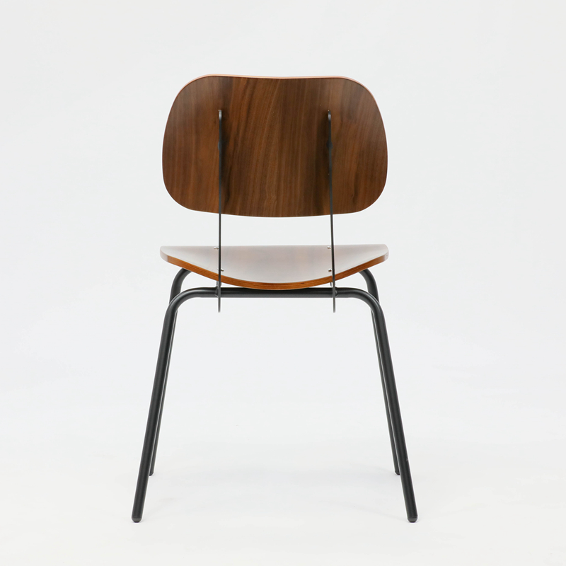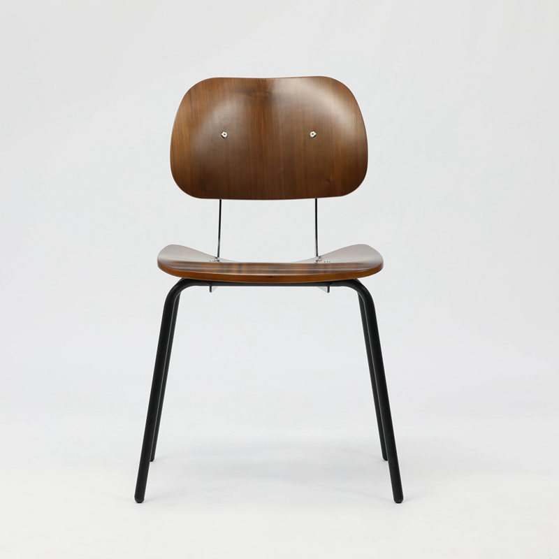 Gold Apple furniture factory manufactures industrial dining chair with bentwood seat and back. A lovely complement to any dining room table or office, this modern metal chair has curved plywood seat and back. Plywood seat and back offers an ergonomic curve to promote comfort. The Walnut laminate finish delivers maximum durability and allows easy cleaning. Metal frame with powder-coated steel legs includes non marring floor glides to protect your floors. They're connected to a light, streamlined steel frame, which shows to a modern look, It is a popular dining room chair, office chair, and restaurant and cafe chair.